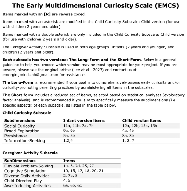 Young children express their curiosity in many different ways, and caregivers support it through a range of behaviors. The Early Multidimensional Curiosity Scale (EMCS) is a comprehensive tool designed to capture this diversity by assessing both early curiosity and curiosity-promoting parenting. The EMCS consists of two subscales: the Child Curiosity Subscale and the Caregiver Activity Subscale. For more information about how the EMCS was developed and validated, please see Lee et al. (2023).